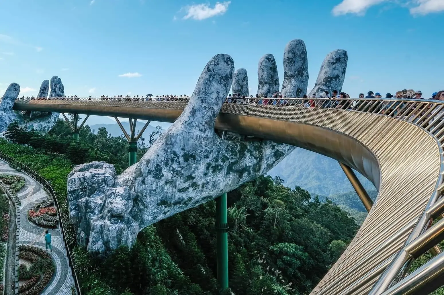 Ba Na Hills is a hill station and resort located in the Truong Son Mountains west of the city of Da Nang, in central Vietnam. The resort is known for its stunning Golden Bridge, French Village architecture, and thrilling cable car rides.